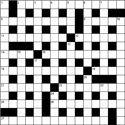 2 Couture among our feathered friends is a repetitive business (6,7) 8 Never sheds! (9) 9 Religion is the French mistress's starting-point (5) 11 Produce confusion in teenager (8) 12 Gilbert wastes time around pet animal (6) 14 Kind of lettering (4) 16 Revolting Robert, that attractive man? (5-5) 18 Marks shading on pavement (10) 19 Land scheme (4) 21 Turns out to be a revolutionary cell (6) 22 One left after tea company goes up in flames (8) 25 A boring practice? (5) 26 He grinds up the basil, right? (9) 27 Fruit of small-scale milk processing industry? (7,6) |