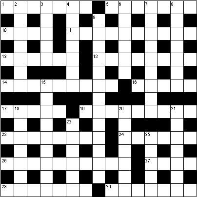 1 Chompity chomp and you'll see in the dark (7) 5 More outporings from EU capital? No, just small green vegatables (7) 10 Taste funny with honey (4) 11 Quality snacks recently apparently withdrawn from Sainsbury's (5,5) 12 Principle ingredient of such snacks (6) 13 Just the tip of the iceberg? Oh go on can we please, say, badly (8) 14 Tipped to be an aphrodisiac (9) 16 Very cheap and nice with toast (5) 17 There's nothing small about this refreshing drink, say, badly (5) 19 Faked agony, say, badly (9) 23 Plaster for sick citrus fruit? (8) 24 Hosts a meeting then sits on them (6) 26 Largest of the melon family (10) 27 It's nice to get to know this foodstuff. Unless you're a vegetarian (4) 28 Cinematic staple (7) 29 Clean your self with these sleeping partners (7) |