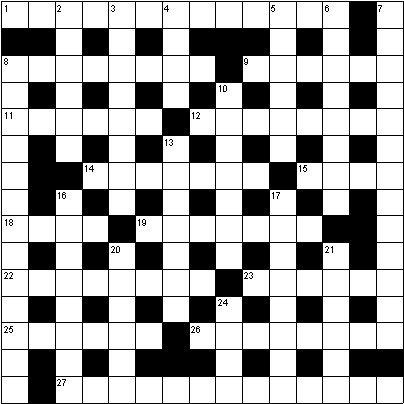 1 Substantial sounding river crossing (6,2,5) 8 Break in journey proves to be bad (8) 9 Stern juggles melons (6) 11 Distant first pitch (6) 12 Launch the soft-flab revolution (5,3) 14 Fool about after school, idiot! (7) 15 A monstrous sound? (4,4) 18 Free Frank (4) 19 Robert's in shame for honesty (7) 22 Something to watch in treacherous company - but you'll need a mirror to see it! (4,4) 23 Restaurant has rook in stock! (6) 25 Horn rental action (6) 26 Ian in city finds outer part of flower (8) 27 Magdalene's smallest church? (6,2,5) |
