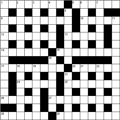 1 Final screen (8) 5 Height or right or fright (6) 9 Helper of malign satanists (9) 10 Strikes over travel expenses (5) 12 Shock treatment? (7) 13 Uneven film series (5) 14 Corrects for drug fixes (6) 15 Came to an understanding that it's dull to be back in a mixed college (8) 17 Emit? (4,4) 20 Found under water and in the street (6) 24 Swallows and seagulls drop a seal to grab apple-core (5) 25 Does not appreciate topless shows (7) 26 Worker in South Africa and North Pole (5) 27 It's clear no promises are made in this (9) 28 A good lady's name (6) 29 Decline and fall (8) |