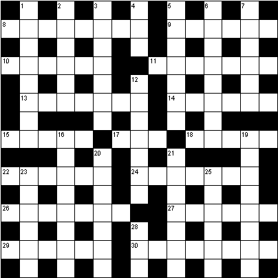 8 I turn one into a particle (8) 9 Where to find courage from MacLean? (6) 10 She's said to linger on (6) 11 Noses round German's wives (7) 13 Aiming towards -- is containing Revelation! (7) 14 Pete's partner in the West Midlands (6) 15 Fashionable rule of relativity? (2-3) 17 Way to weld car parts together (3) 18 Three points my opponent makes (5) 22 Aristocratic black is not redundant (6) 24 Weight of fish surrounding island (7) 26 Newspaper with feckless 27 provokes change with sit-in (7) 27 Change or you'll find an egomaniac (6) 29 Where you won't find Petula (6) 30 Romans turn tail before Scotsmen (8) |