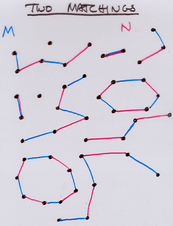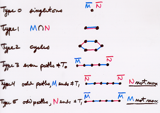 M and N be matching in G, let H be the graph with the same vertex set as G, and edges M (union) N. Then the components of H are each, one of the following six types.Claude Berge's Theorem