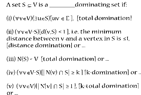 c V be a set of vertices having some property P of interest. We say that S is a P-set. In particular, consider a dominating set S which also has one of the following properties P, defined in terms of the subgraph < S > induced by S: